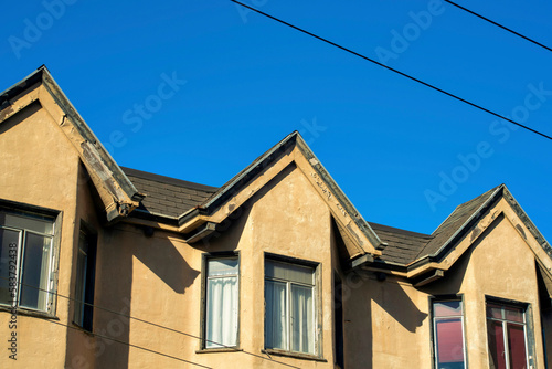 Apartment building with row of decorative gable style roofs and windows with overhead power lines in city