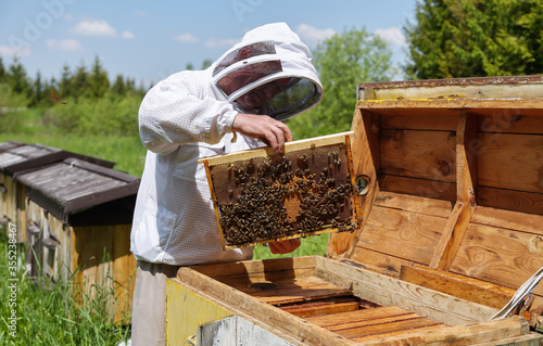 Apiculture. Apiary. Wooden hive. Beekeeper holds in the hands the frame of honeycombs. Carpathian honey bee. Pretty wooden hives. Beautiful spring day.