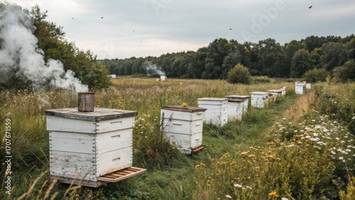 Apiculture scene: A row of wooden beehives stands in a sunlit meadow. Smoke rises from the entrance of several of the hives.