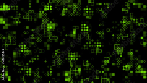 Appearing and disappearing 2d Lime green circles and squares digital background, dark futuristic virtual background