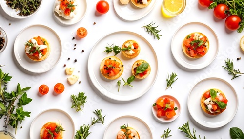 appetiser, tapas, food, plate, white, red, small, colourful, fresh, rosemary, tomatoes, herb, garlic, lemon, garnish, platter, arrangement, delicious, cookery, widener, snack, finger food, epicure, healthy, flavorful, tasty, vibrant, bite, delicate, summer, ingredient, preparation, presentation, top, view, light, background, dish, meal, plate, savoury
