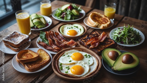 Appetizing brunch meal featuring sunny-side-up eggs, crispy bacon, French toast, and fresh juice
