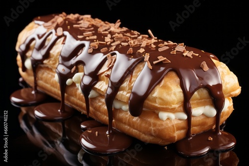 Appetizing chocolate eclair. Traditional American cuisine. Popular authentic desserts. Background with selective focus
