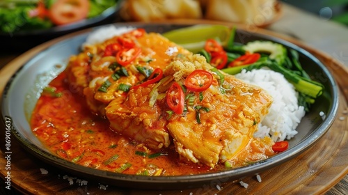 Appetizing Indonesian Chicken Dish with Vibrant Vegetable Accompaniments on Rustic Plate