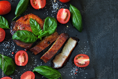 Appetizing meat steak with tomatoes and basil. Keto diet. Paleo diet. Pegan Diet.