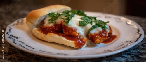 meatball, sub, sandwich, mozzarella, cheese, basil, tomatoes, sauce, bread, italian, american, cookery, food, meal, lunch, dinner, plate, delicious, tasty, fresh, homemade, cooked, baked, ingredient, receipe, dish, snack, gastronomy, culinary, tradition, culture, comfort, eat, kitchen, table, eatery, cafes, deli, nobody, closeup, view, serving, portion, presentation, style, background, marble, counter