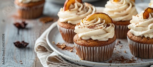 Apple cupcakes topped with cream cheese frosting and garnished with dried apple slices and cinnamon powder. A fall-themed treat. Handmade baked goods served on a ceramic dish.