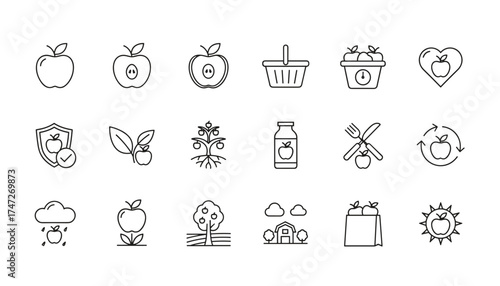 apple, icon, vector, set, line, fruit, food, healthy, organic, fresh, farm, farming, agriculture, harvest, fruit farm, tree, plant, juice, diet, eating, grocery, shopping, basket, nature, growth, leaf, seed, sun, weather, symbol, signs, illustration, outline, graphic, collection, pictogram, simple, minimal, quality, eco, sustainable, cider, nourishment, vitamin, vegetarian, vegan, market, produce