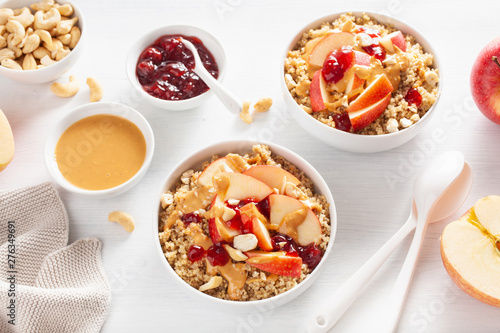 apple peanut butter quinoa bowl with jam and cashew for healthy breakfast