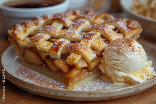 Apple Pie - A slice of apple pie with a lattice crust, served with vanilla ice cream.