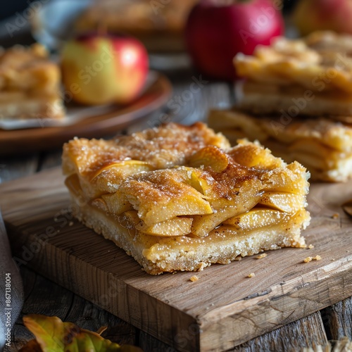 Apple pie bars with a shortbread crust and spiced apple filling, presented on a rustic wooden table