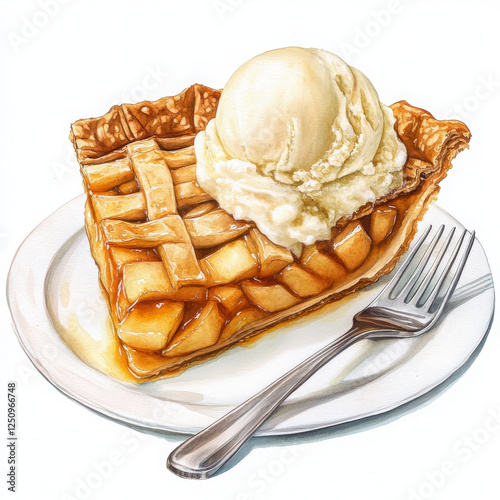 apple, pie, slice, vanilla, ice, cream, dessert, food, sweet, baked, pastry, delicious, dish, plate, fork, bakery, homemade, epicure, tasty, traditional, crust, filling, lattice, sugar, cinnamon, gold, brown, warm, cooked, fresh, single, portion, lunch, dinner, snack, treat, indulgence, culinary, cookery, closeup, still, life, illustration, painted, realistic, style, water, refreshment