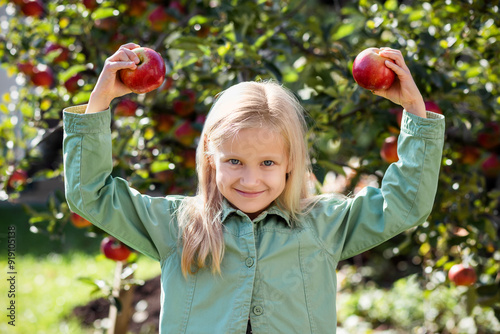 Apples Children. Apple Harvest. Strong Little Child Girl Picking Apples Having fun in Apple Garden. Healthy Snack Eating in Good mood concept.