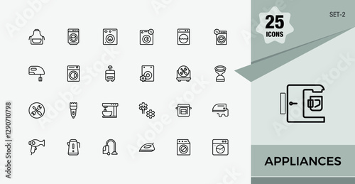 Appliances icon pack. Contains linear outline icons like fridge, juicer, iron, cooker, toaster, oven, television. Web icons. Minimalist editable vector stroke.
