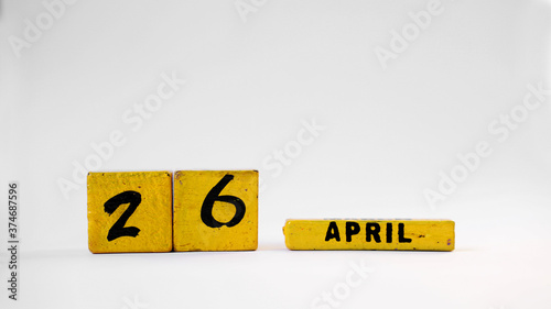 APRIL 26 Wooden calendar. World Intellectual Property Day. International Chernobyl Disaster Remembrance Day. White background with space for your text.