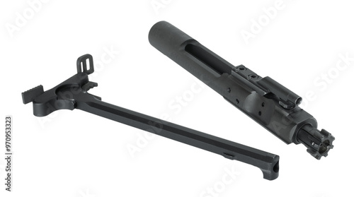 handle, bolt, firearm, weapon, gun, assault rifle, gear, equipment, part, component, real, nobody, no people, black, isolated, maintenance, repair, metal, object, 2, white, grey, grey