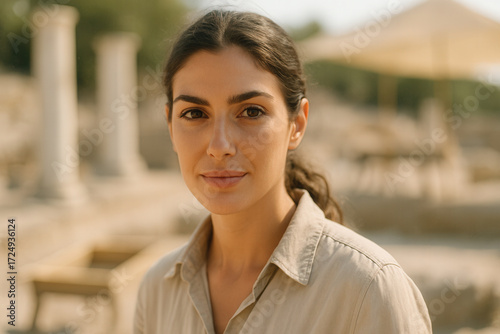 archaeologist, woman, excavation, ruin, heritage, history, research, site, column, stone, ancient, antiquity, culture, scientist, professional, female, adult, portrait, outdoors, sunlight, warmth, dusty, earth, discovery, study, discipline, conservation, education, career, confidence