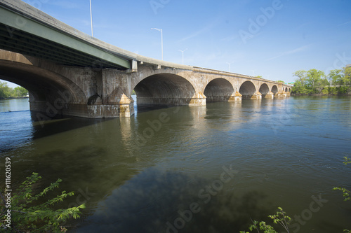 Arches of the Bulkeley Bridge connect Hartford and East Hartford across the Connecticut River on a sunny spring day.