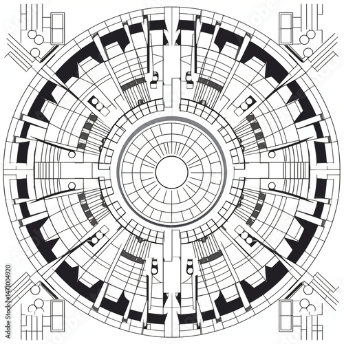 circle, design, pattern, symmetry, architecture, geometric, abstract, radial, structure, interior, dome, line, black, white, art, modern, detail, complex, futuristic, plan, blueprint, concept, drawing, illustration, graphic, space, energy, movement, perspective