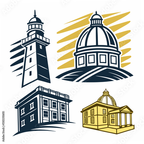 lighthouse, capitol building, government building, historical building, navy blue, gold, graphic design, icon, symbol, landmark, city landscape, structure, building, architecture, design element, graphic icons, vector graphics