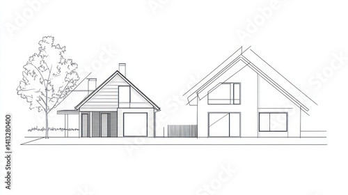 house, architectural, design, vignetting, plan, building, modern, home, facades, exterior, site, new, construction, drawing, blueprint, property, residential, 2, home, family, suburban, contemporary, planning, plot, elevation, front, side, perspective, tree, yard, fence, landscaping, garden, blueprint, illustration, line