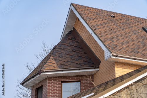 elevation, domestic, architecture, facades, weather, building, exterior, estate, gable, pitch, real, housing, structure, home, framework, geometric, window, apex, gutter, wall, light, residential, coverage, pattern, upward, house, eaves, construction, trim, property, material, protection, brown, angle, roof, view, siding, shape, shingle, tiling, dwelling, element, asphalt, daytime, brick