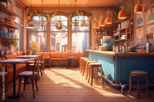 building, architecture, furniture, eatery, table, three-dimensional, interior design, illustration, cartoon, hot drink, chair, cafes, room, background, lightning, window, house, cosy, food, wood, bar, downloadable, chandelier, graphic, human, home, lamp, shop, american, style, vibe, warm, copy space, absence, indoor, estate, inside, stool, coffee, seat, hd, lighting equipment