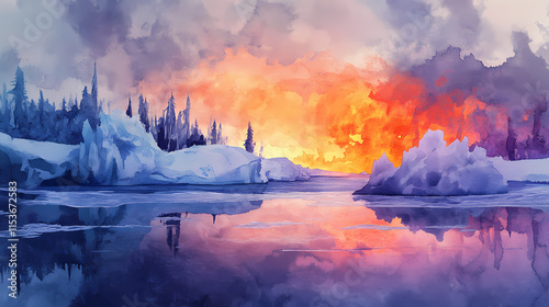Arctic frostfire: watercolor panorama of glowing flora amidst frozen tundra. Frostfire. Illustration