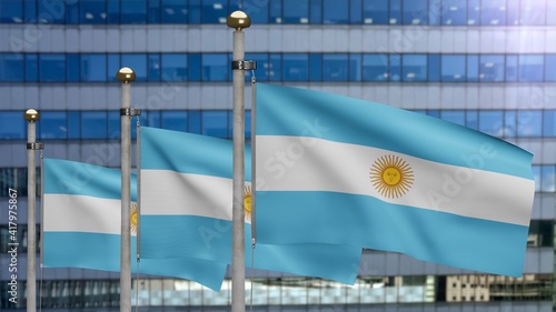 Argentinian flag waving in a modern skyscraper city. Tall tower Argentine banner