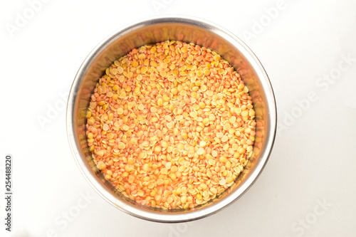 arhar and malka pulses with water in steel bowl isolated on whitw background