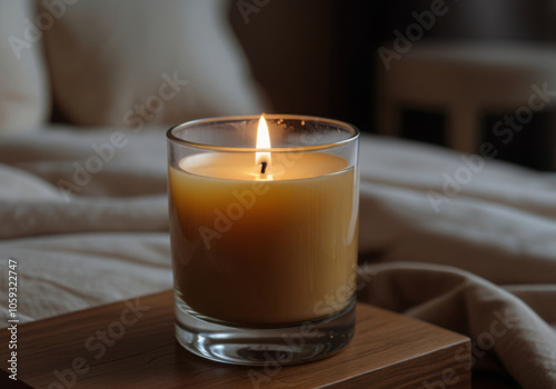 aroma candle on the coffee table close-up, against the backdrop of the bedroom