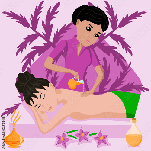 Aromatherapy massage. Therapy and treatment by professional therapist in SPA. Isolated flat vector illustration. Indian and Asian ethnicity.