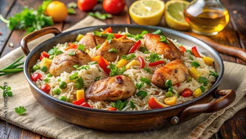 Aromatic basmati rice is served with juicy chicken pieces and colorful mixed vegetables in a large serving dish , chicken, vegetables