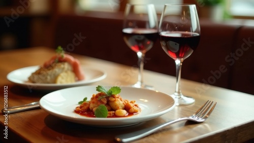 red wine, wine glass, dinner, fine dining, eatery, food, dish, bean, tomatoes, sauce, fish, elegant, wooden table, setting, garnish, culinary, epicure, delicious, accessing, meal, plating