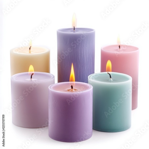 Aromatic Candle Collection: Six vibrant pillar candles, each in a different pastel hue, cast a warm, inviting glow. The candles, arranged in a semi-circle.