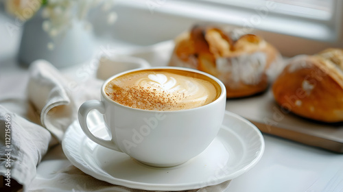 Aromatic cappuccino with latte art, served with freshly baked bread on a bright windowsill.