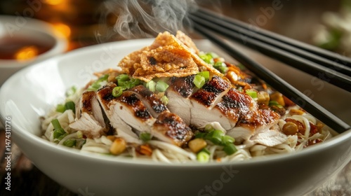 noodle, chicken, crispy, topping, aromatic, flavorful, hot, steaming, delicious, bowl, plate, asian, food, lunch, dinner, eatery, fresh, tasty, spicey, savoury, lunchtime, dining, homemade, comfort, meal, protein, carb, cookery, appetising, dinnertime, fast food, deliciously, traditional, chinese