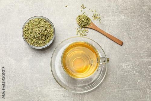 Aromatic fennel tea and seeds on light grey table, flat lay