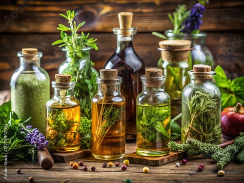 Aromatic Herbal Oils in Glass Bottles: Natural Remedy & Wellness Stock Photo