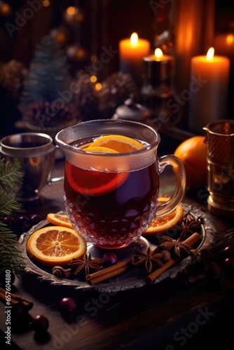 Aromatic hot mulled wine in glass cap with spices and citrus fruit on a table. Snow in evening. Concept of festive atmosphere and cozy winter mood. Traditional hot Christmas drink