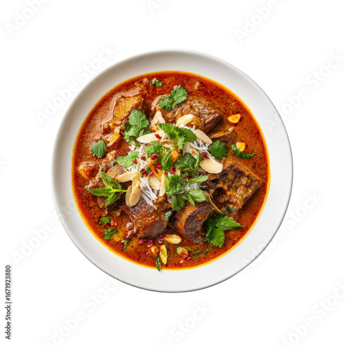 Aromatic Lamb Curry in a White Bowl, Overhead Shot