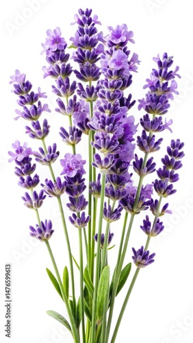 Aromatic lavender bouquet with vibrant purple flowers and verdant green stems on white