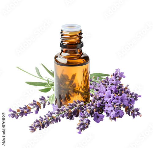 Aromatic lavender essential oil in amber bottle on black backdrop creates serenity