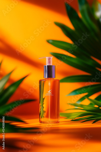 liquid, bottle, product, photo, commercial, poster, white, beauty, cosmetic, orange, background, plant, leaf, container, pump, lotion, skincare, health, spa, treatment, aromatherapy, wellness, package, design, luxury, elegant, shadow, tropical, botanical, natural, care, hydratation, moisture, nourish, freshness, clean, relaxation, indulgence, calm, peaceful, soothing, illuminating, radiant, vibrant, refreshing, advertisement