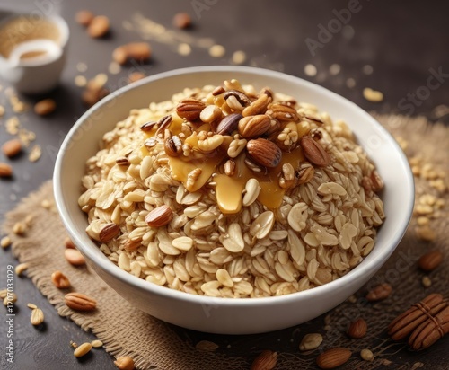 Aromatic oats with honey drizzle and crunchy nuts on top, crunch, texture, nutty