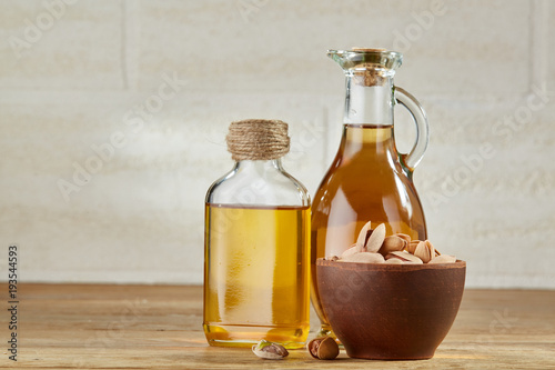 Aromatic oil in a glass jar and bottle with pistachios in bowl on wooden table, close-up.