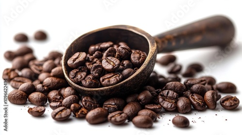 hot drink, bean, roasted, aroma, dark, brown, rich, scoop, wooden, spoon, closeup, food, drink, caffeine, beverage, energy, breakfast, morning, delicious, epicure, organic, agriculture, product, texture, detail, still life, photo, image, isolated, white background