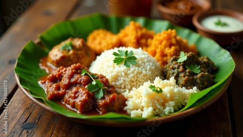 Aromatic Spiced Cuisine Featuring Steamed Rice, Savory Curries, and Vibrant Vegetable Dishes Served on a Banana Leaf Platter