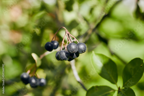 Aronia berries (Aronia melanocarpa, Black Chokeberry) bunch Aronia melanocarpa berries hanging on a tree.