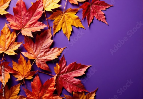 Arrangement of Red and Orange Autumn Maple Leaves on Purple Background